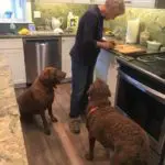 Cord had some seizure issues, but we were determined to carefully administer his meds to ensure the best possible regimen to control them. The meds did make Cord a bit wobbly in his hindquarters, but he always managed to remain alert while taking them. His prescription food also seemed to ensure fewer episodes. Cord needed to lose a bit of weight and we limited his treats to healthy low-calorie items like green beans and carrots. Here you see both Cord and Ruby waiting for their special treats to be prepared. After a few months, Mr. Cord was successful at becoming his svelte former self! In November, he weighed in at 77.4 pounds – 10 pounds less than when he came to us. Luckily, all those blackberries that he would pick for himself didn’t prevent him from losing the much-needed weight!