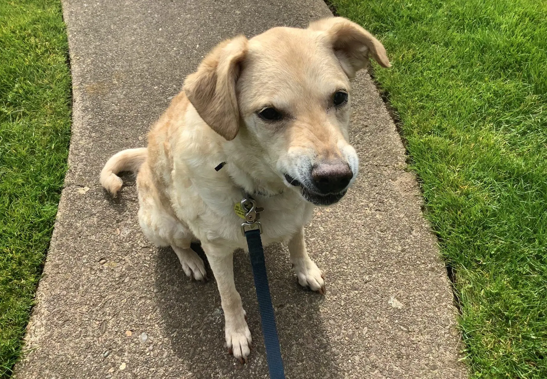 Stella was favorably evaluated in Springfield, OR for entry into CBRR&R on March 3, 2020. Stella was a 9-year-old spayed female born on April 20, 2011. She was living in a large apartment complex with her owner who, due to financial reasons, had to move out of his apartment into another which would not allow dogs. Stella, a light dead grass Chessie mix, was adopted in September 2018 after her owner saw her on the shelter’s regularly featured spot the on the local TV station. Sadly, Stella had had most of her teeth removed due to gingivitis while at the shelter but appeared to be healthy otherwise. Stella, while not actually a service dog, helped her owner overcome his anxiety by being with him in a public setting. He reported that she was well behaved and able to stay in the apartment for long periods of time without getting into anything and seldom barked. She loved people but didn’t have a lot of interest in other dogs or toys. During her evaluation, she walked nicely on a leash, seemed to enjoy her walk, and was very interested in her surroundings. She was quite polite, taking cheese treats gently, but checking in with her owner to see that it was ok! While she had not received much in the way of training, she would routinely sit when asked and appeared to be alert and engaged. Other than the information gained from her owner and during the evaluation, little was known of Stella’s early years. It was a big plus that she had the Elvis-style Chessie grin!