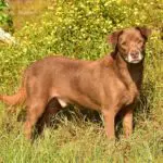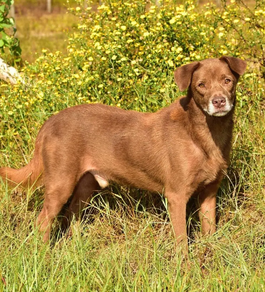He is a is a fun lovin little Chessie mix. He is so affectionate and just loves people (anyone and everyone). He is good with female dogs. His best friend in boarding is a Catahula dog named Jasmine. His favorite hobbies other than snuggling with humans and hanging out with other female dogs is to hunt frogs around the pond. Swimming is not his thing.